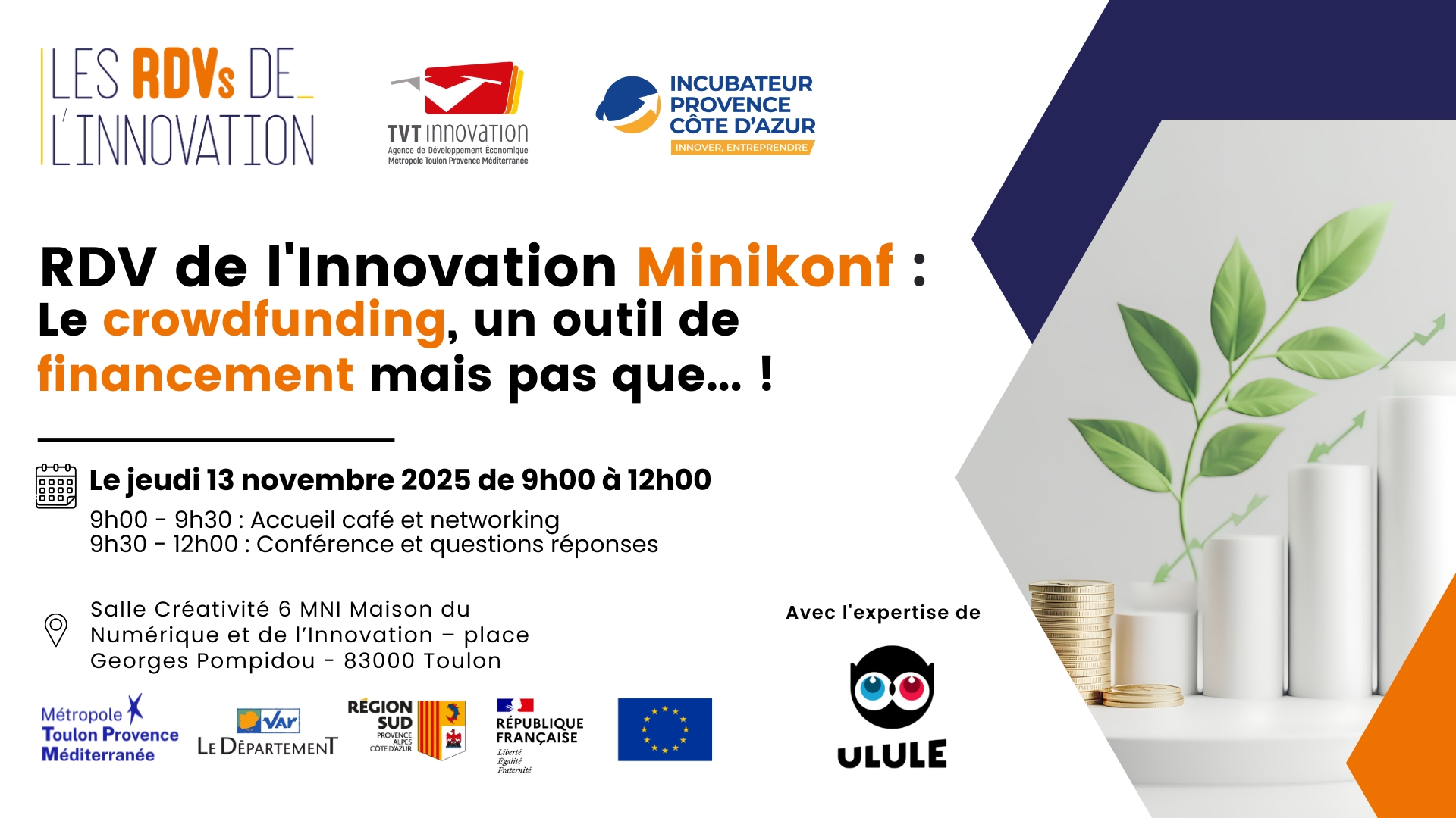 🚀 TVT Innovation, en partenariat avec l'Incubateur Provence-Côte d'Azur, a le plaisir de vous convier à une mini-conférence sur le thème « Le crowdfunding, un outil de financement mais pas que… ! » avec l'intervention d'Isabelle DAO PRUNEL - Community Captain pour Ulule région Sud